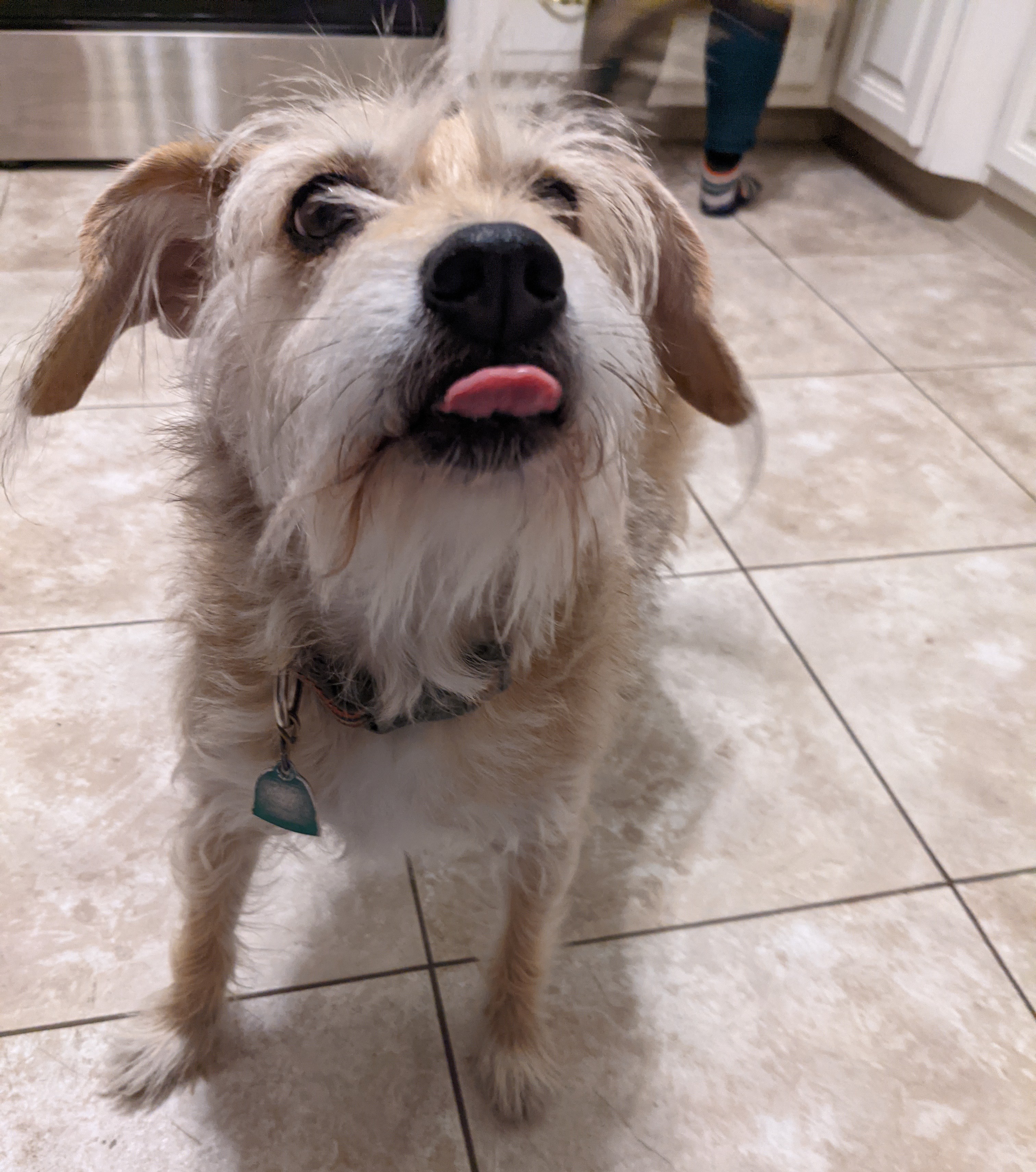 My dad is always feeding her under the dinner table, so of course she has a terrible begging habit. She'll rest her chin on our legs and give us the sad puppy dog eyes to get what she wants. She'll beg no matter what we're eating, since she's too short to be able to see what's on the table and therefore has no way of knowing what we're actually eating until we give her some.