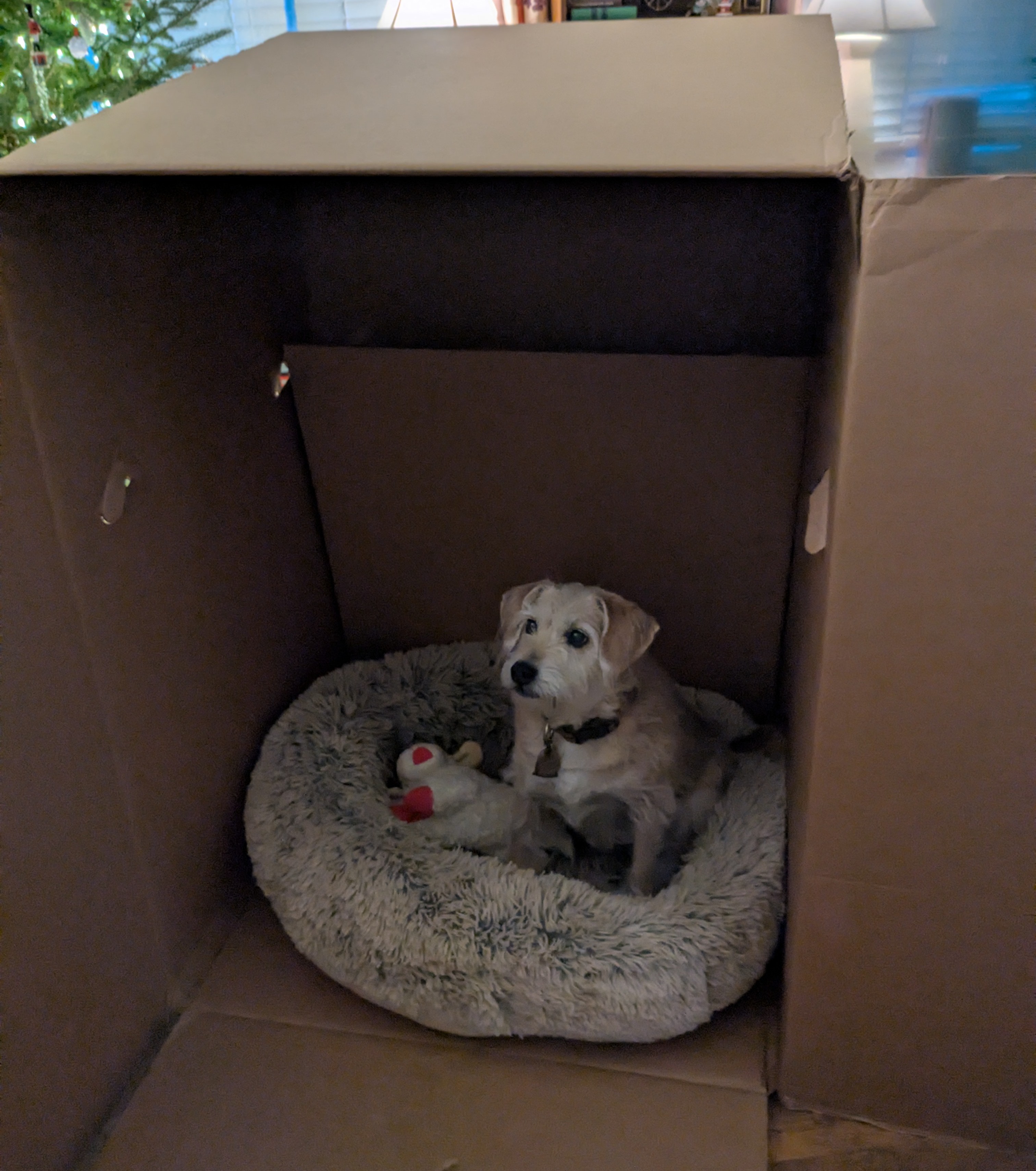 It brings us great joy when my sister and I put Poppy Cotton into funny situations. We sometimes surround her with stuff while she's asleep, pick her up and put her into laundry baskets or on chairs, or ambush her with kisses on her very floofy face. One of my favorite situations we thrust Poppy into was when we got her to sit in this box.