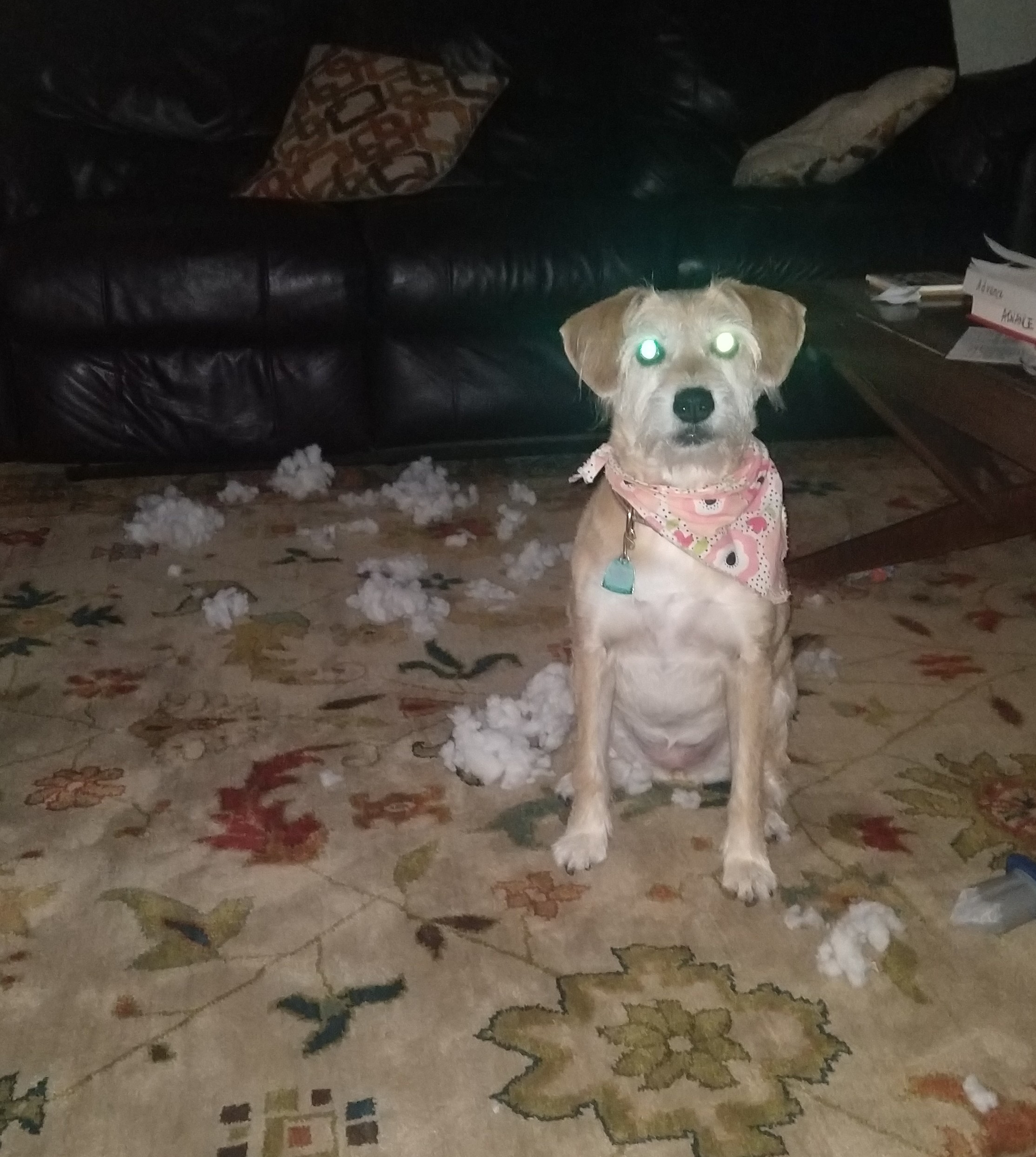 Most of these anecdotes make Poppy sound like a perfect angel who can do no wrong, which is true and accurate. However she does occasionally engage in activities that, if she were not so adorable and cute, would be considered atrocious and unforgivable by us civilized folk. Here she is surrounded by the carnage of a stuffed animal.