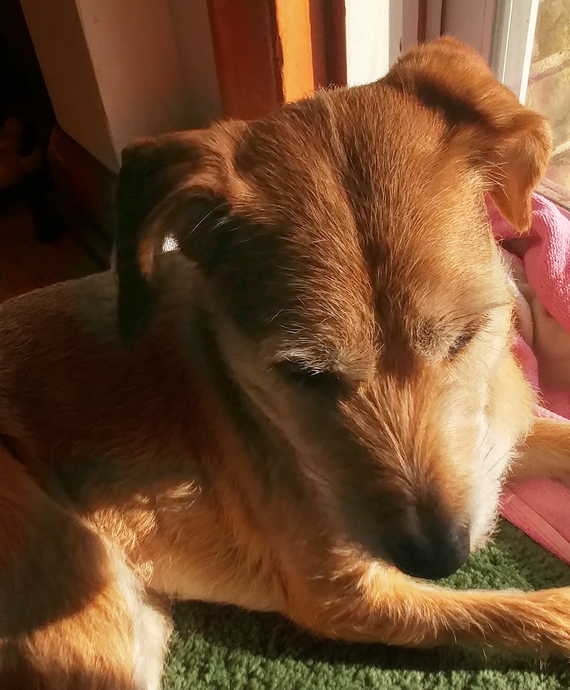 Besides her dog bed, the ottoman, the couch, and each of our beds, Poppy also likes to sleep right in front of the front door. This is because the front door lets in lots of sunlight during the day, so Poppy will camp out in front of the door to cash in on that sweet, sweet sunlight. She looks real pretty during golden hour.